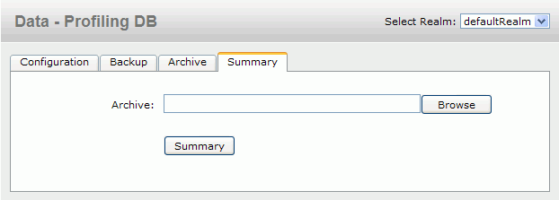 This panel is displayed when you click Data on the system toolbar of the JReport Administration page and then select Profiling DB from the drop-down menu. It allows you to manage server data, such as configuring your profiling database, backing up server data, archiving/restoring server data, and viewing backup and archive files' summary information.