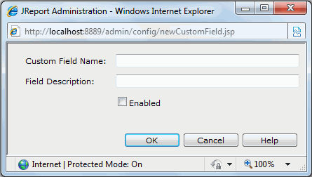 This dialog is displayed when you click the New Custom Field link in the Configuration > Custom Field panel on the JReport Administration page. It is used to create user defined fields which can be used as resource properties. See the dialog.