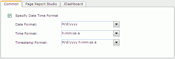 This tab allows you to define the default date and time formats in which such values will be displayed on the Page Report Studio, Web Report Studio and JDashboard web pages. See the tab.